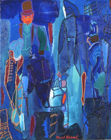 "Ambiance de quartier". Acrylique rehaussée à l'huile sur toile