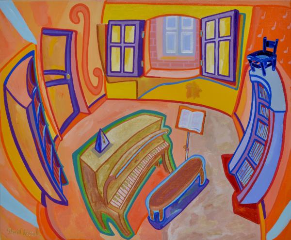 Ah, il a l’air malin à marteler le temps pour personne ! Personne ? Qui sait… Tiens, les fenêtres sont ouvertes, quelqu’un pourrait entrer, ou s’en est-il envolé ? Le salon de musique attend les interprètes et le public. La chaise perchée se tient déjà prête à applaudir.